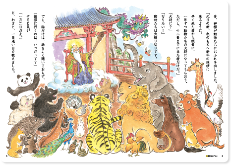 12年に一度だけ巡ってくる動物の王様の座を巡って、1月1日に神様のもとへ挨拶に行くことになります。ただし、王様になれるのは、12番目までに挨拶に来た動物だけ。急いで行かなければ、王様にはなれません。鼠はどうして一番になることができたのでしょうか? それぞれの動物たちの個性が楽しく描かれます。